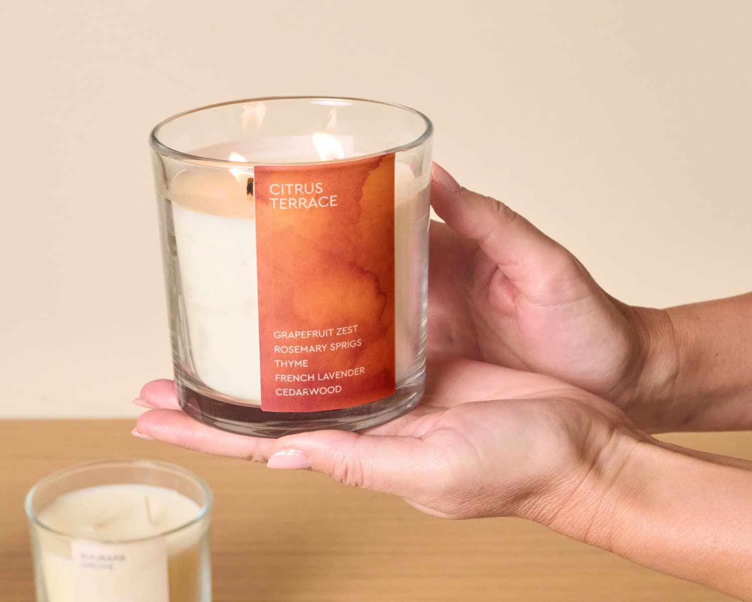 - Citrus Terrace (Orange): Grapefruit Zest | Rosemary Sprigs | Thyme | French Lavender | Cedarwood